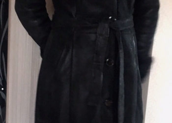 Дубленка в отличном состоянии, цвет чёрный, с капюшоном, размер 46, облегающая, выше колен.