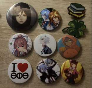 значки из аниме атака титанов, доки доки литературный клуб, евангелион, юттд (твой черед умереть) и другие значки средние...