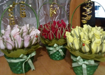 Все любят цветы и конфеты. Дарите красиво. Букет из 21 бутона. В каждом конфетка "Марсианка". Диаметр букета около 20 см.