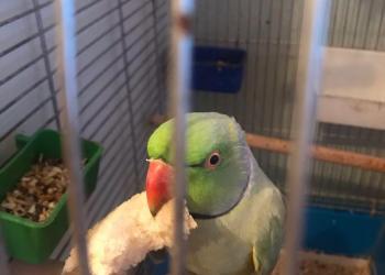 Срочно в связи отъездом в другой город продаётся попугай с большой клеткой,кормушки,поилка.
